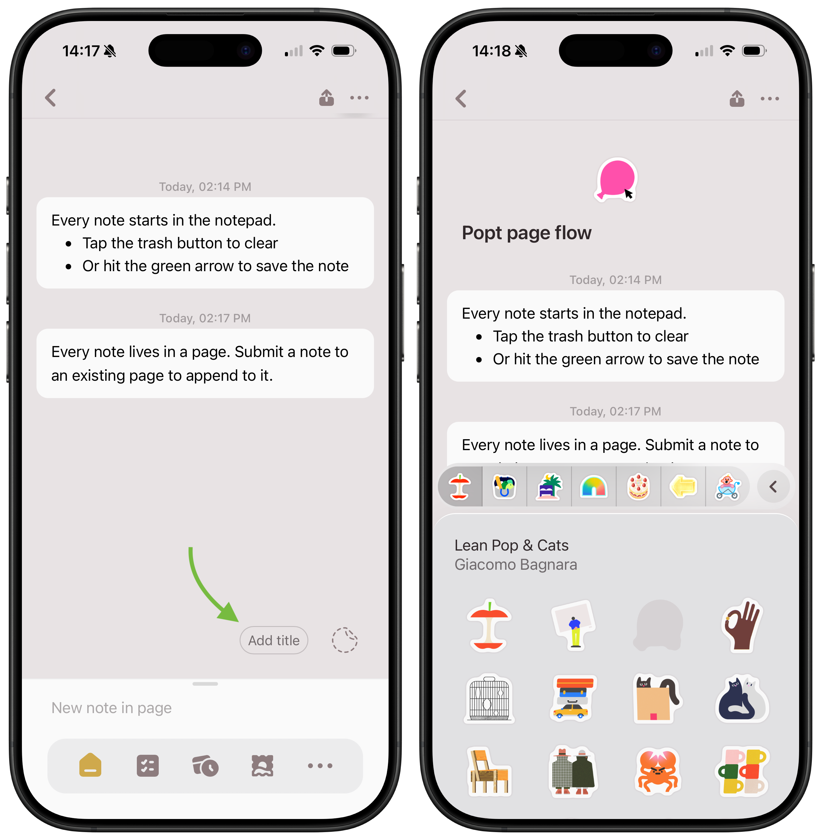 Popt uses the first line of a page as its implicit title, but you can also give a page a custom title, and pick a sticker to make it stand out: